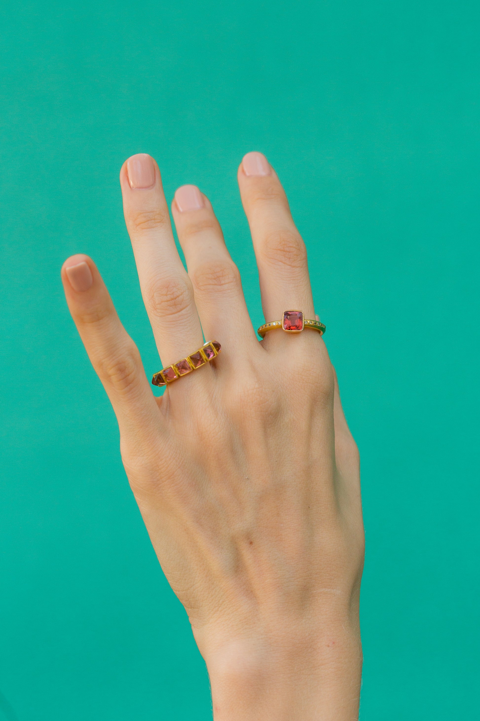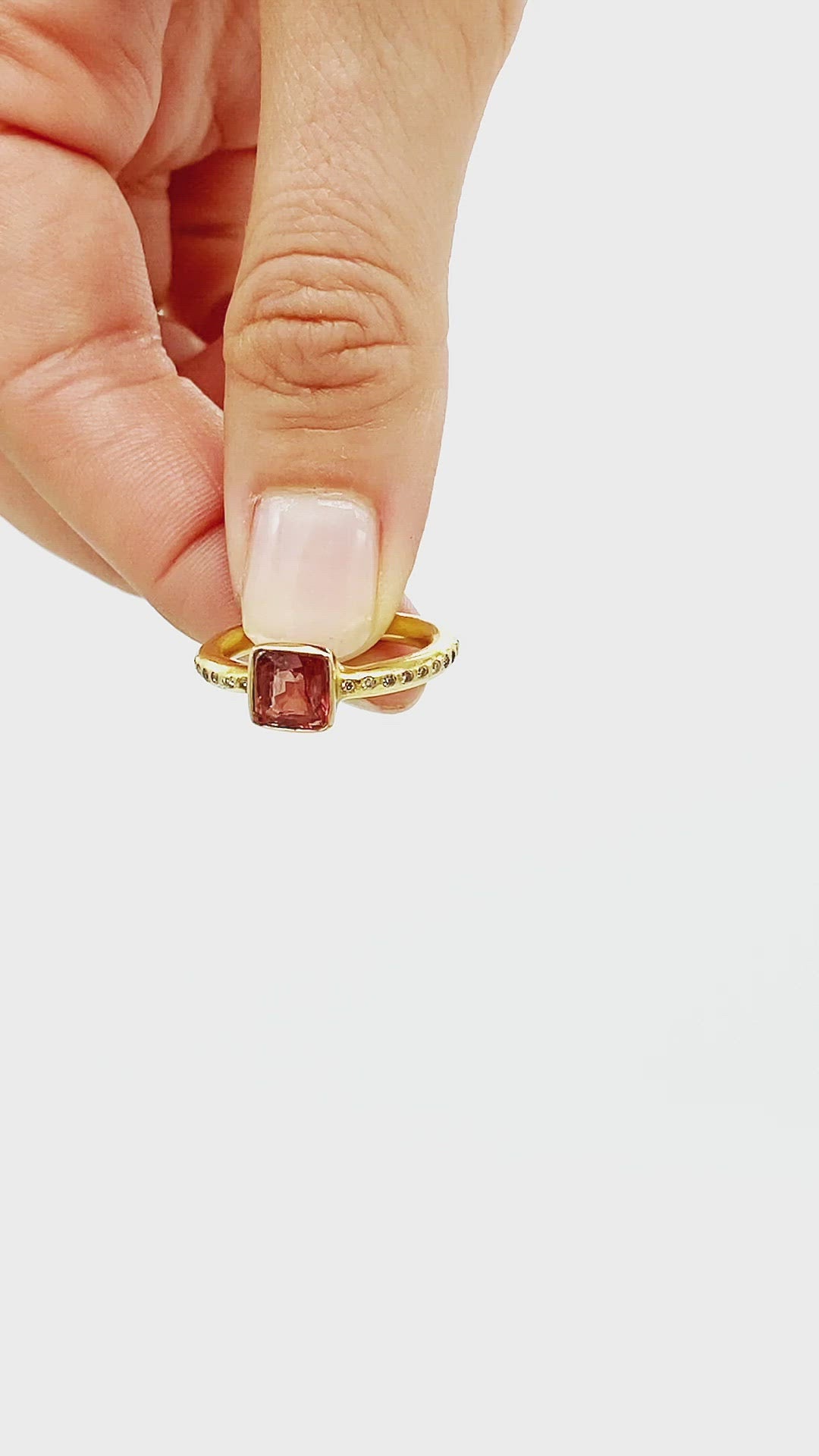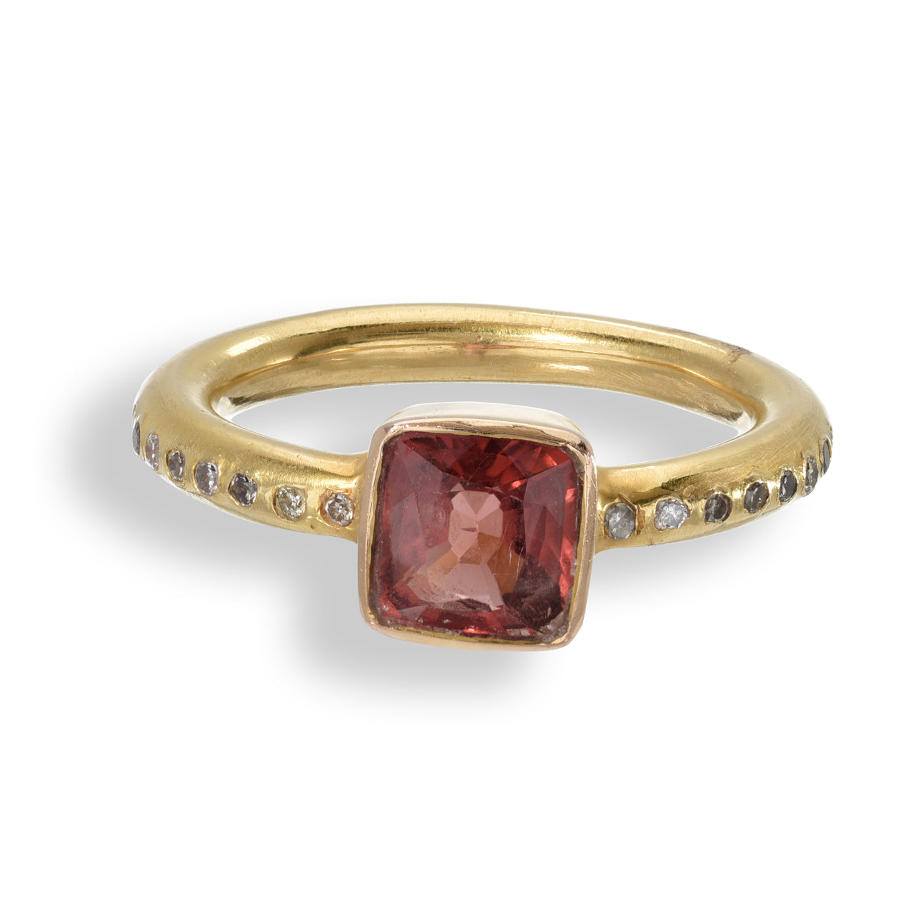 With a fiery cushion cut peach tourmaline, flanked by rustic diamonds and set into 18K gold. Ready to ship in size 7.25 (one size only).