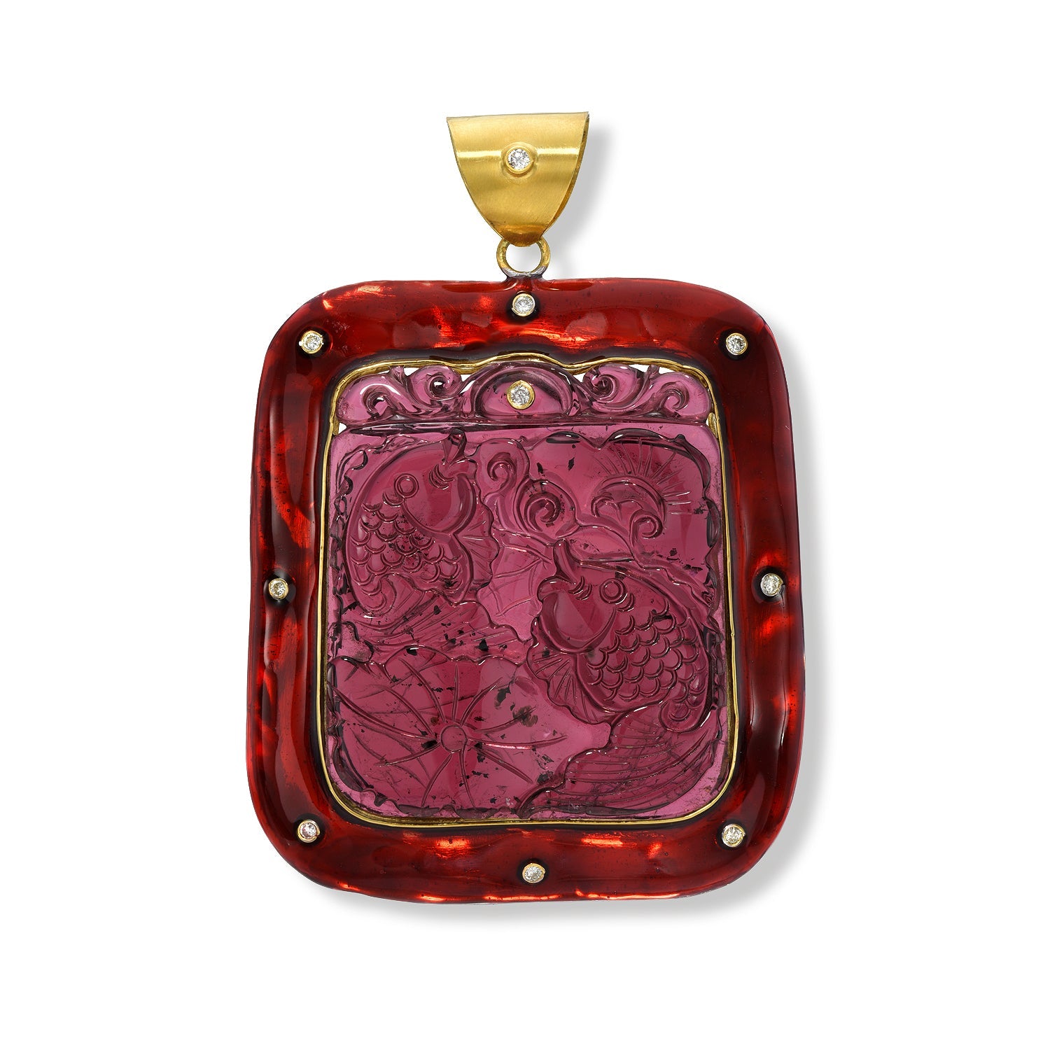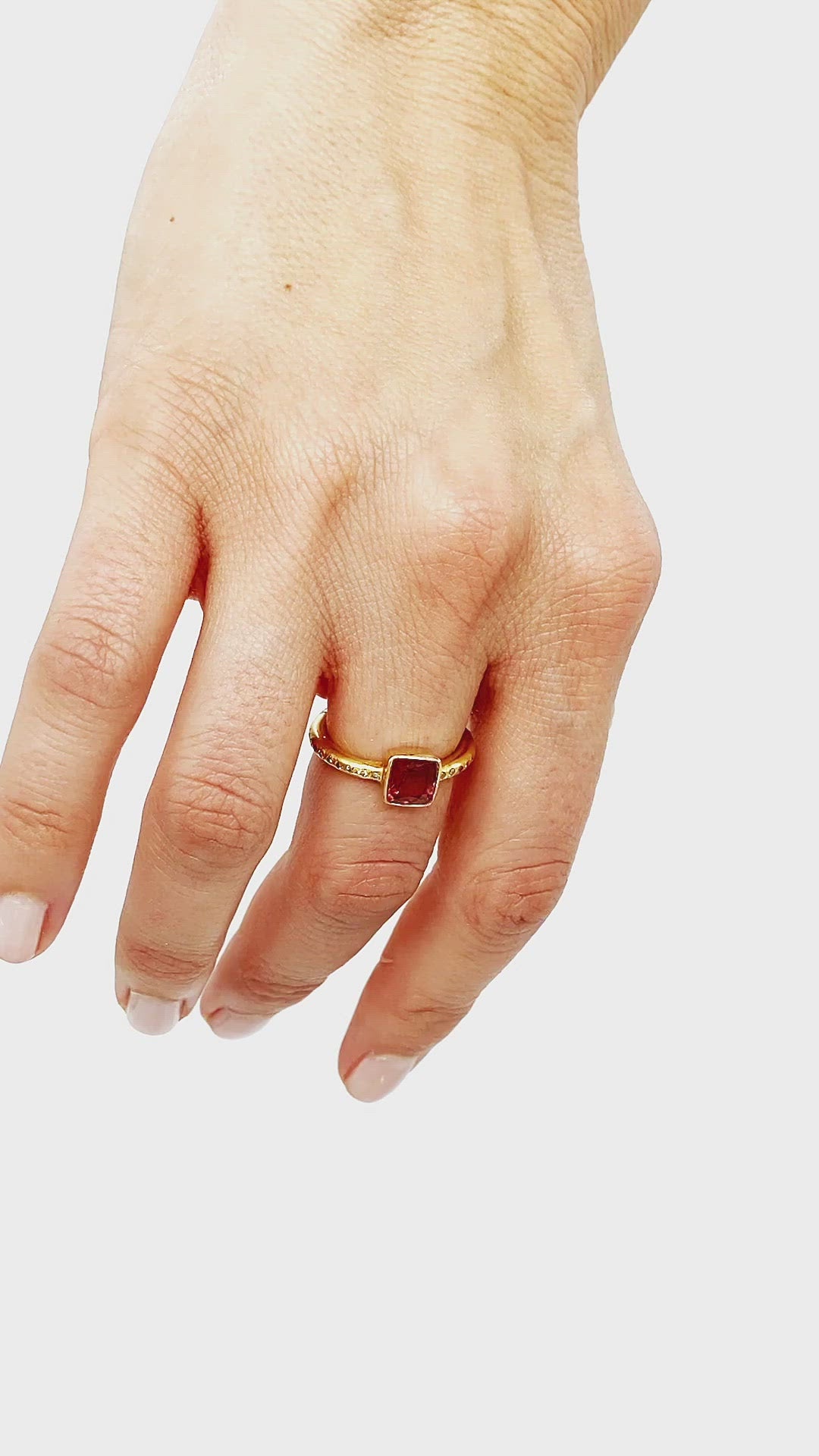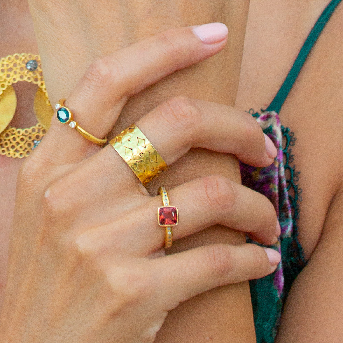 With a fiery cushion cut peach tourmaline, flanked by rustic diamonds and set into 18K gold. Ready to ship in size 7.25 (one size only).
