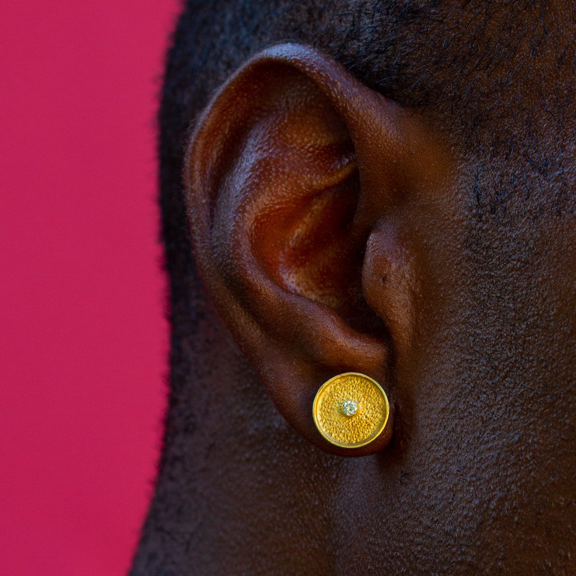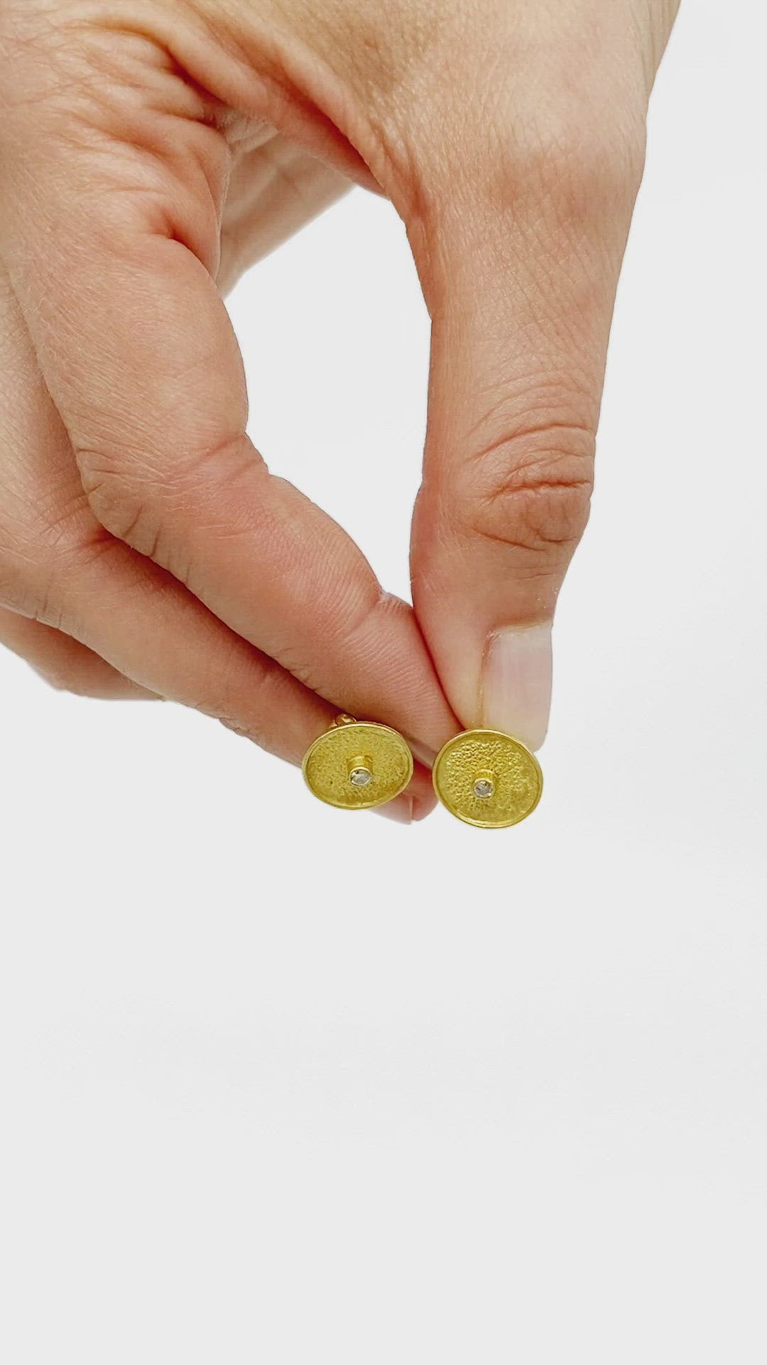 Diamond Stud Earrings in 18K gold. Approx 0.5 in across, 0.11 carats. Handmade textured gold.