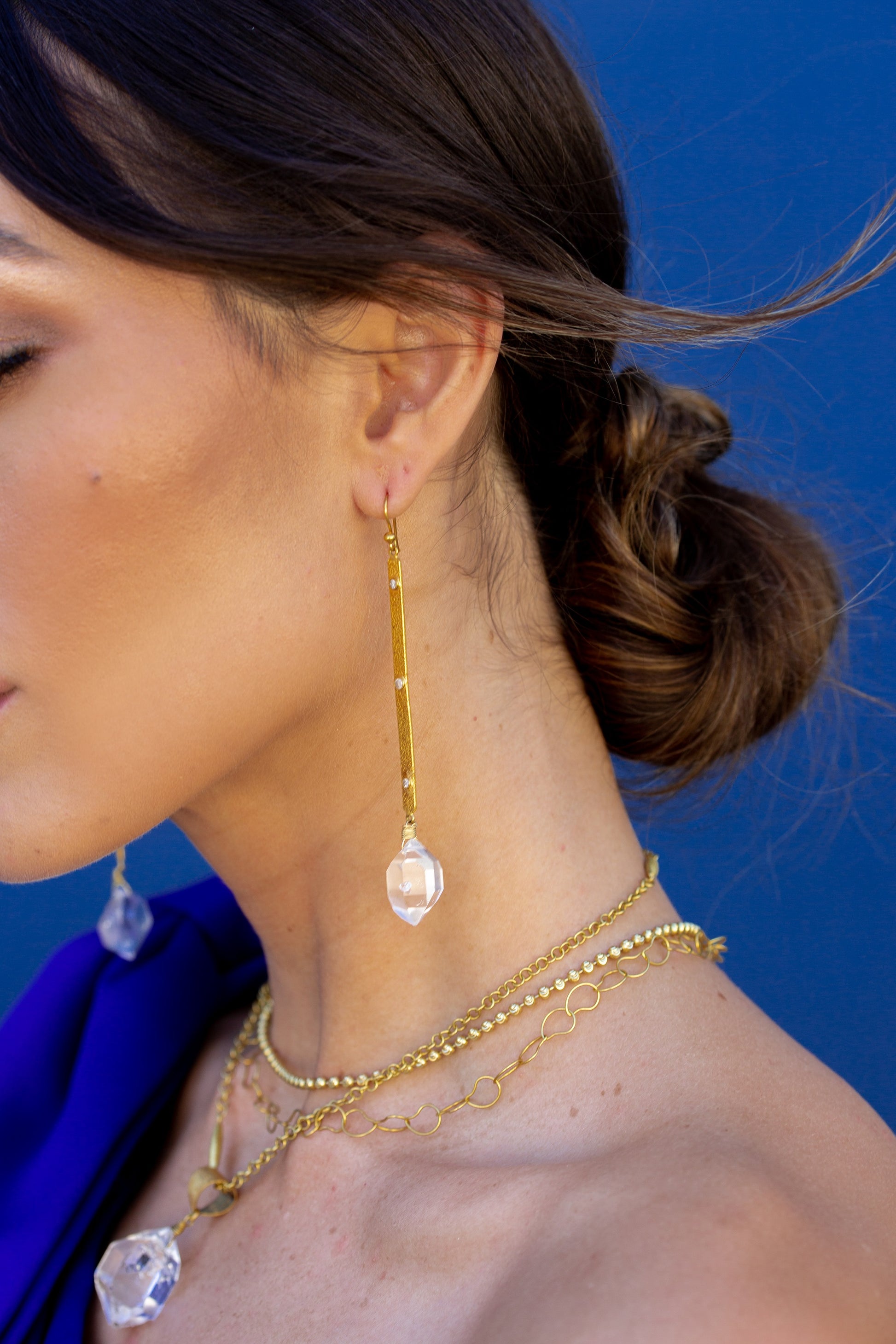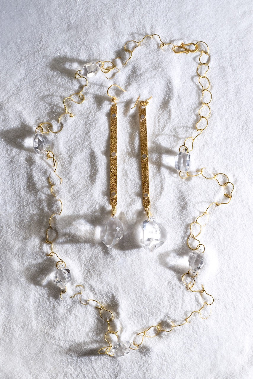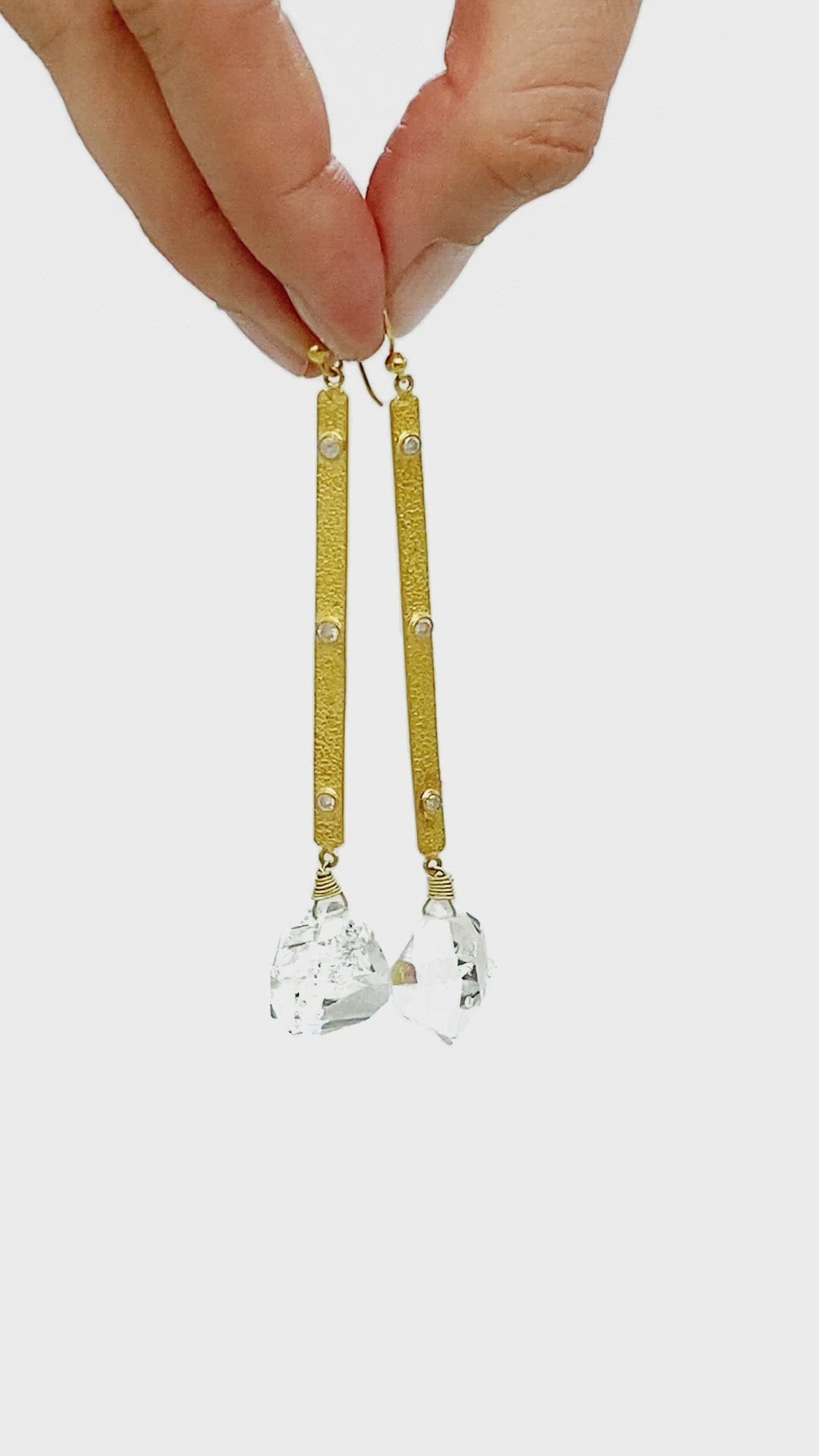 These high quality herkimer diamonds dance when worn. Created in textured 18K gold with diamond accents. Handmade with natural herkimer quartz, one-of-a-kind. Length: 4 in. Textured 18K gold with diamond accents.