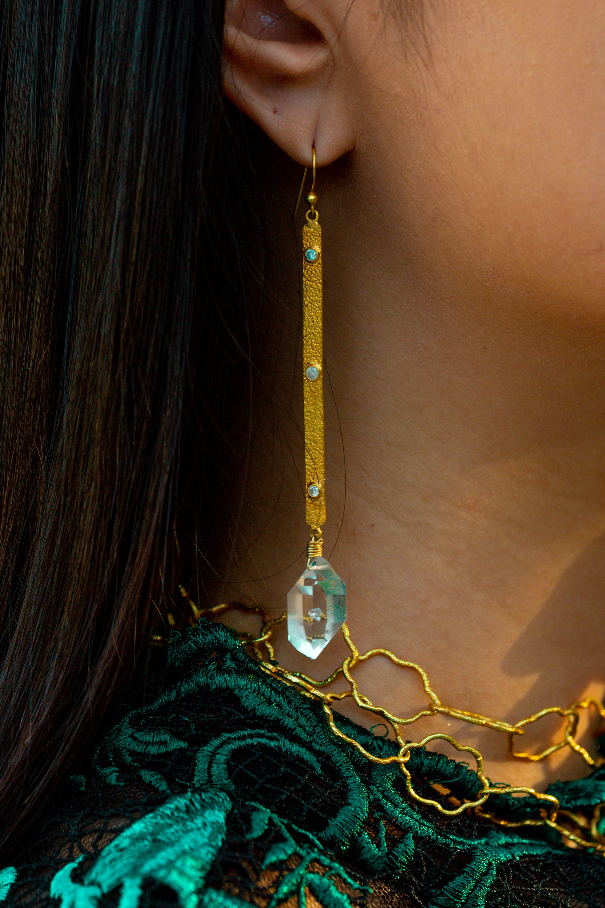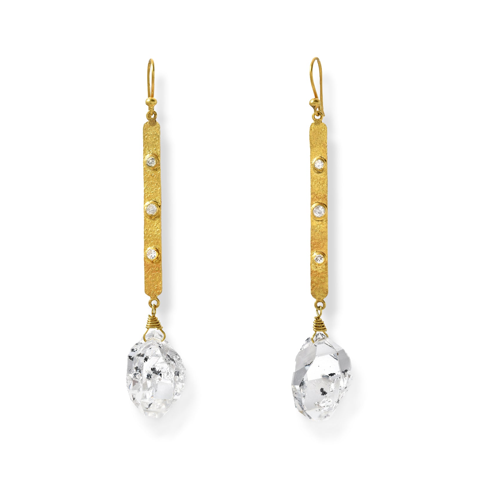 These high quality herkimer diamonds dance when worn. Created in textured 18K gold with diamond accents.
