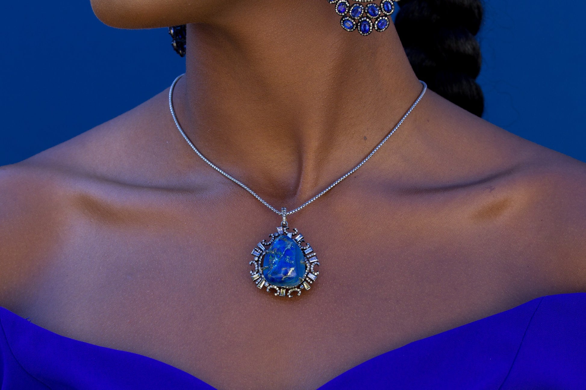 This lapis carving is created with high quality lapis and set into a frame of diamonds in oxidized silver. Best paired with our beaded, link, and paperclip chains.